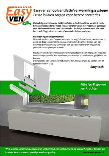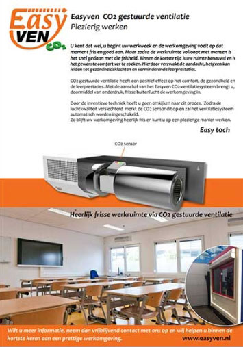 Een luchtventilatiesysteem zorgt voor een frisse en gezonde omgeving. Het installeren van een ventilatiesysteem op school of het regelen van luchtverversing op kantoor is van belang voor werknemers, leraren en de scholieren. Het verbetert de concentratie, het is goed voor de gezondheid én het zorgt voor comfort. Daarom bieden wij praktische en – niet geheel onbelangrijk – betaalbare oplossingen die bijdragen aan de luchtkwaliteit van uw gebouw. Zo kunt u bij ons terecht voor de installatie van ons eigen ventilatiesysteem; de EasyVen Ventilatiebox. Dit CO₂-ventilatiesysteem is makkelijk toepasbaar en het brengt frisse buitenlucht het klaslokaal of de kantoorruimte in.